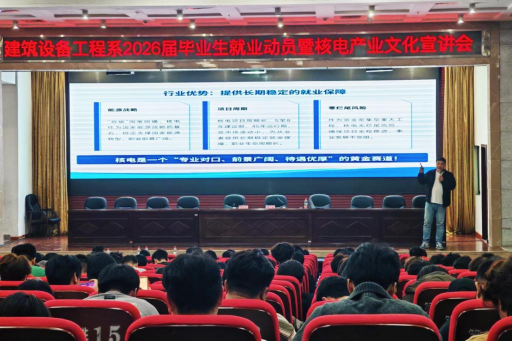 本网讯 为引导毕业生树立正确的职业观、就业观,深入了解核电产业文化及行业发展趋势,10月29日,建筑设备工程系在学术报告厅举办2026届毕业生就业动员暨核电产业文化宣讲会,400余名毕业生及毕业班辅导员参会。
