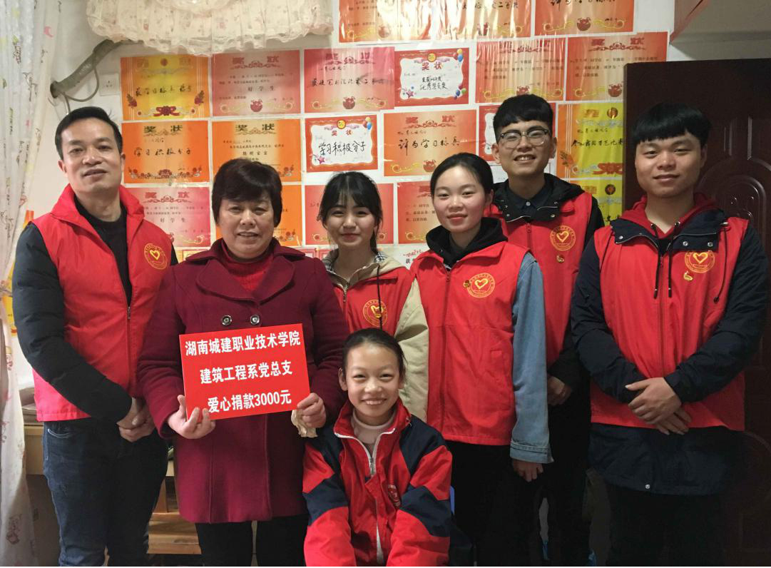 3月14日中午,建筑工程系党总支组织学生支部党员和各班级青年志愿者代表20人,连续三年慰问我院退休职工黄炳强患白血病的孙儿黄丹毅并捐献爱心款。
