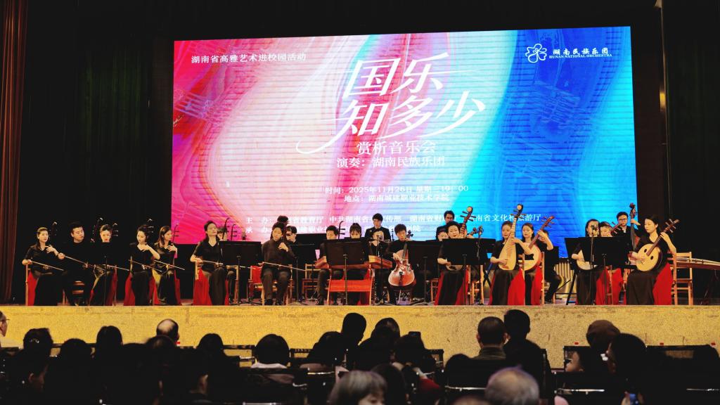 本网讯 11月26日晚,学院体育馆内灯火璀璨、掌声阵阵,湖南省高雅艺术进校园——《国乐知多少》赏析音乐会精彩上演。来自湖南省歌舞剧院湖南民族乐团的艺术家们以精湛技艺奏响国乐华章,全院1500余名师生现场沉浸式感受中华优秀传统文化的独特魅力。